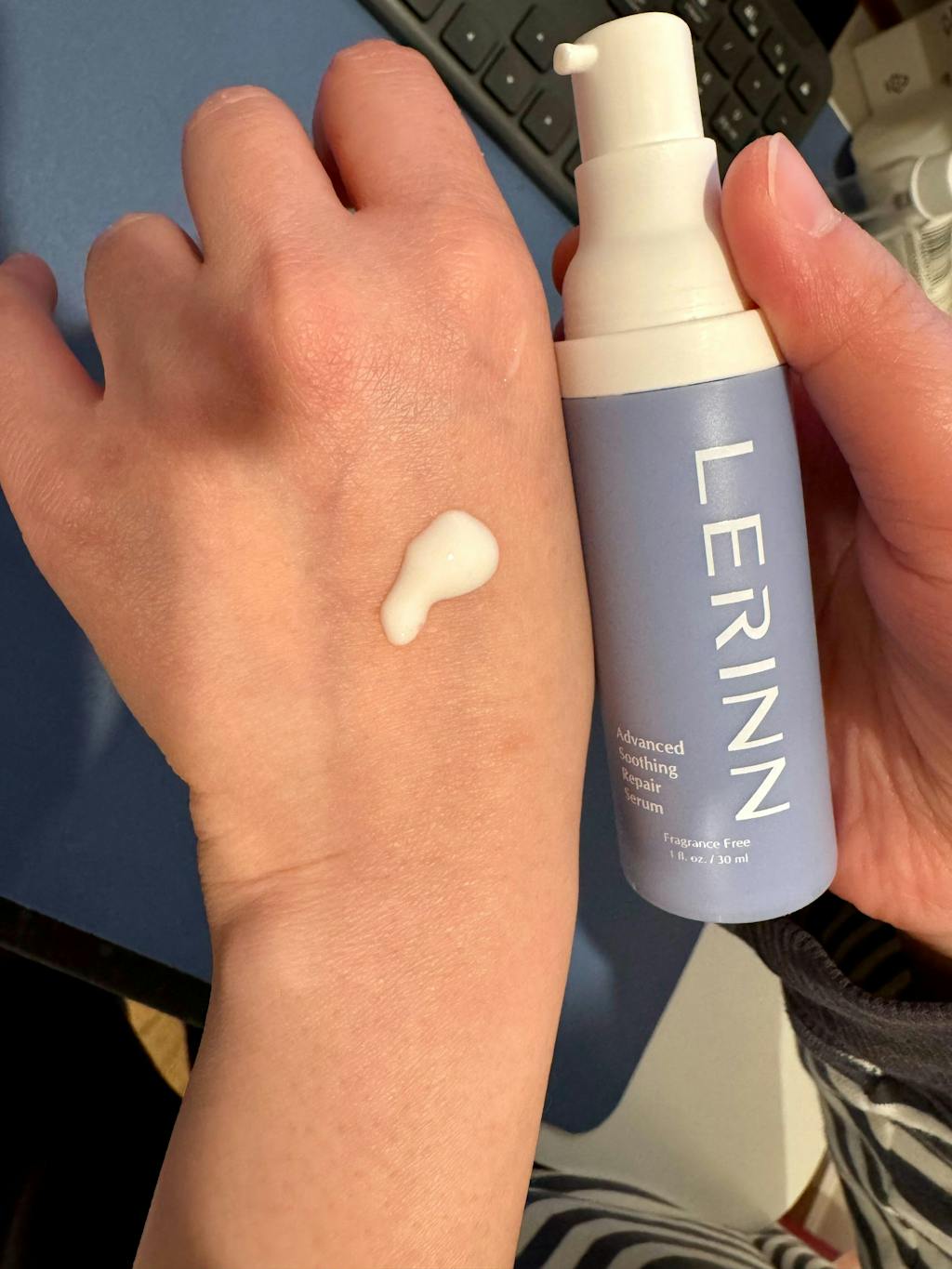 No. The Lerinn Advanced Soothing Repair Serum is completely fragrance free. Any subtle scent you may notice comes naturally from its active ingredients and botanical extracts, with nothing artificial added. Fragrance free formulas are generally better tolerated by all skin types, especially sensitive or reactive skin. We hope you enjoy its gentle, clean finish.