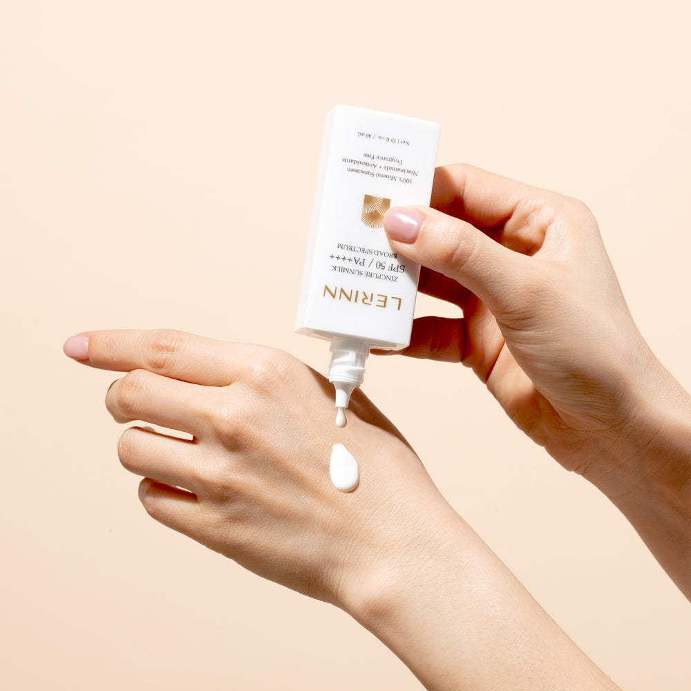 A: For sensitive skin, dermatologists recommend mineral sunscreens with zinc oxide or titanium dioxide. These ingredients sit on the skin’s surface to provide gentle, effective UV protection without causing irritation. Lerinn ZincPure Sunmilk SPF 50 is specially formulated for sensitive skin and dermatologist-tested, offering soothing, reliable daily protection.